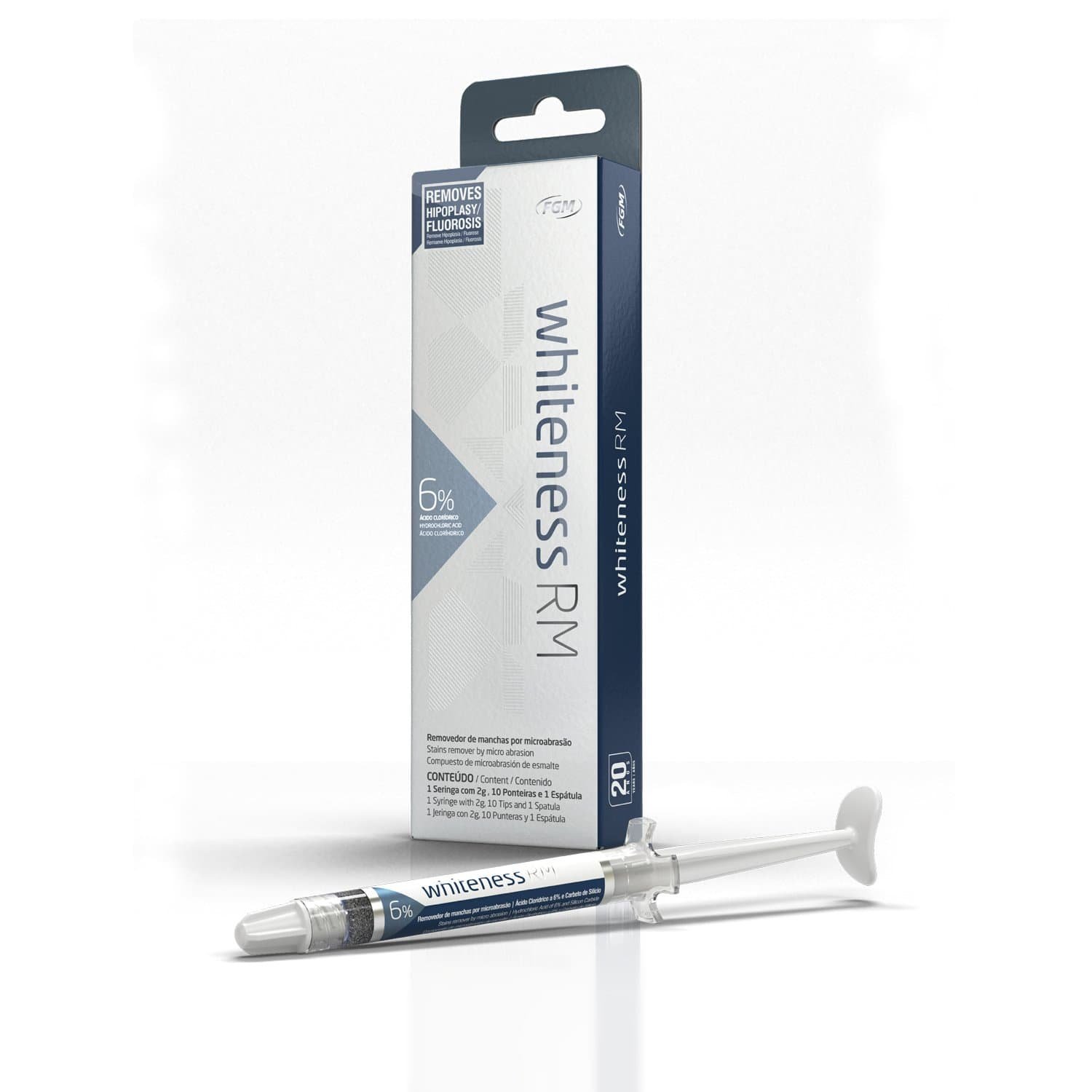 FGM Whiteness RM is a stain remover based on enamel microabrasion, formulated with 6% hydrochloric acid and silicon carbide. Silicon carbide is extremely hard and sharp, providing greater effectiveness when compared to softer abrasives such as pumice stone. This combination makes Whiteness RM a medium-power product with high efficiency for controlled enamel stain removal.