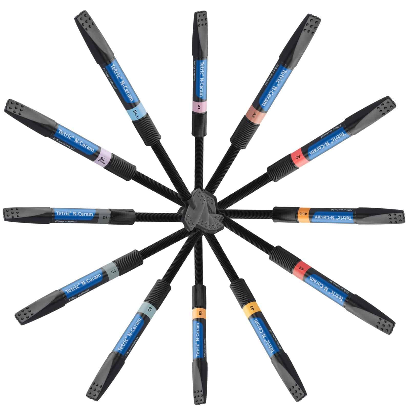 Tetric N-Ceram is available in 18 shades – 11 enamel, 3 dentin, 1 incisal, and 3 bleach shades. It is supplied in both syringes and Cavifils. The shade range includes eleven universal materials, which can be combined with three dentin, one transpa, or three bleach shades depending on clinical requirements.