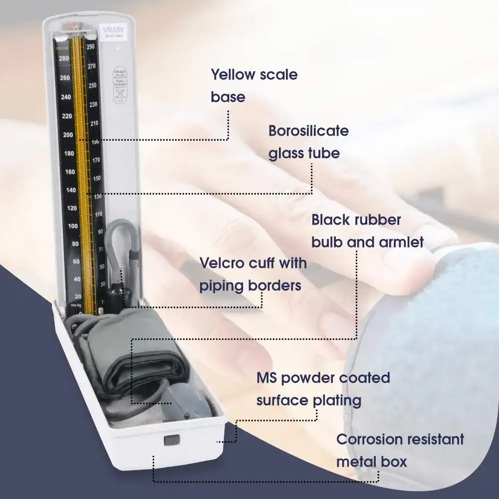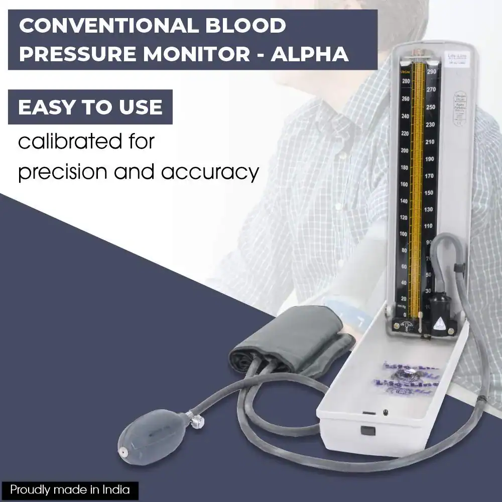Life-line BP Monitor Mercurial ALPHA is a traditional desk-type mercurial sphygmomanometer supplied in a lightweight metal case. It is designed to provide quick, safe, and reliable blood pressure readings in clinical and general healthcare settings.