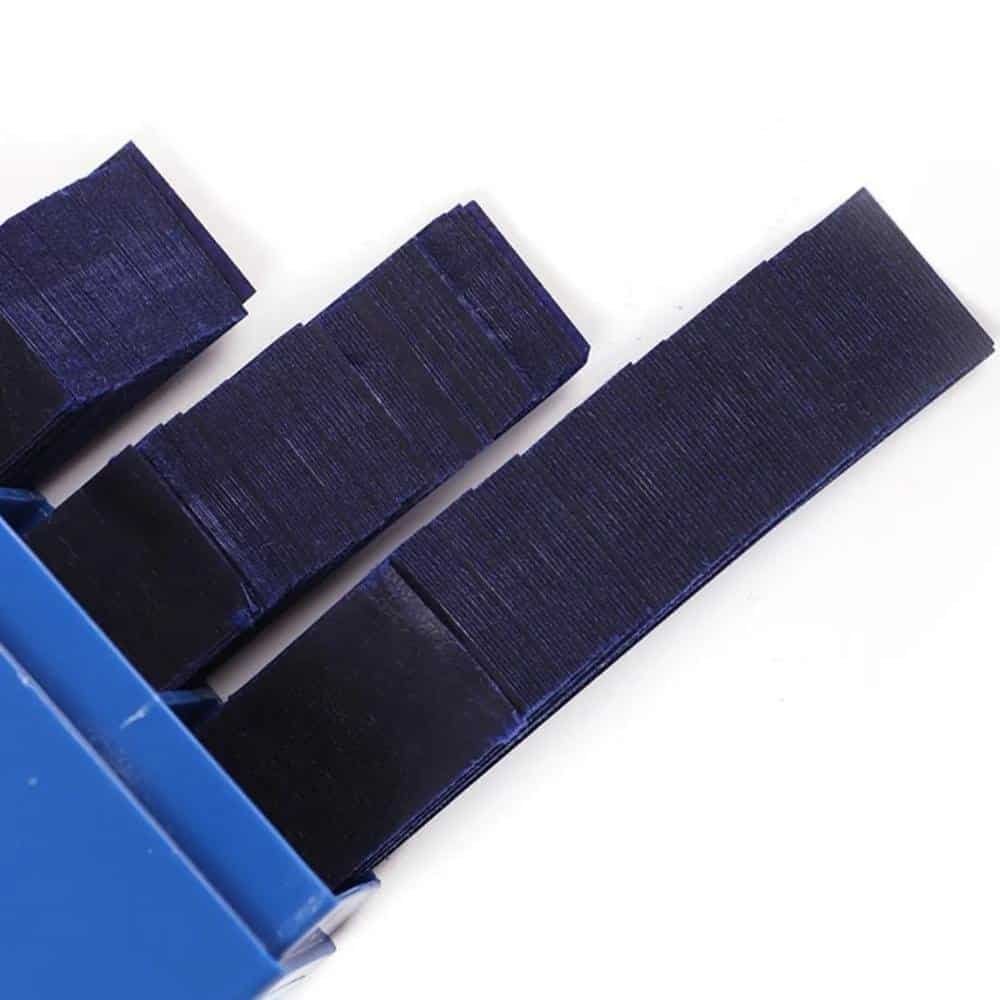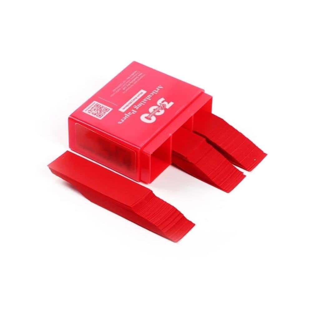 It is used to identify occlusal contact points during natural tooth occlusion and dental prosthesis placement. Darker markings indicate areas requiring adjustment. - Difference between red and blue articulating paper?