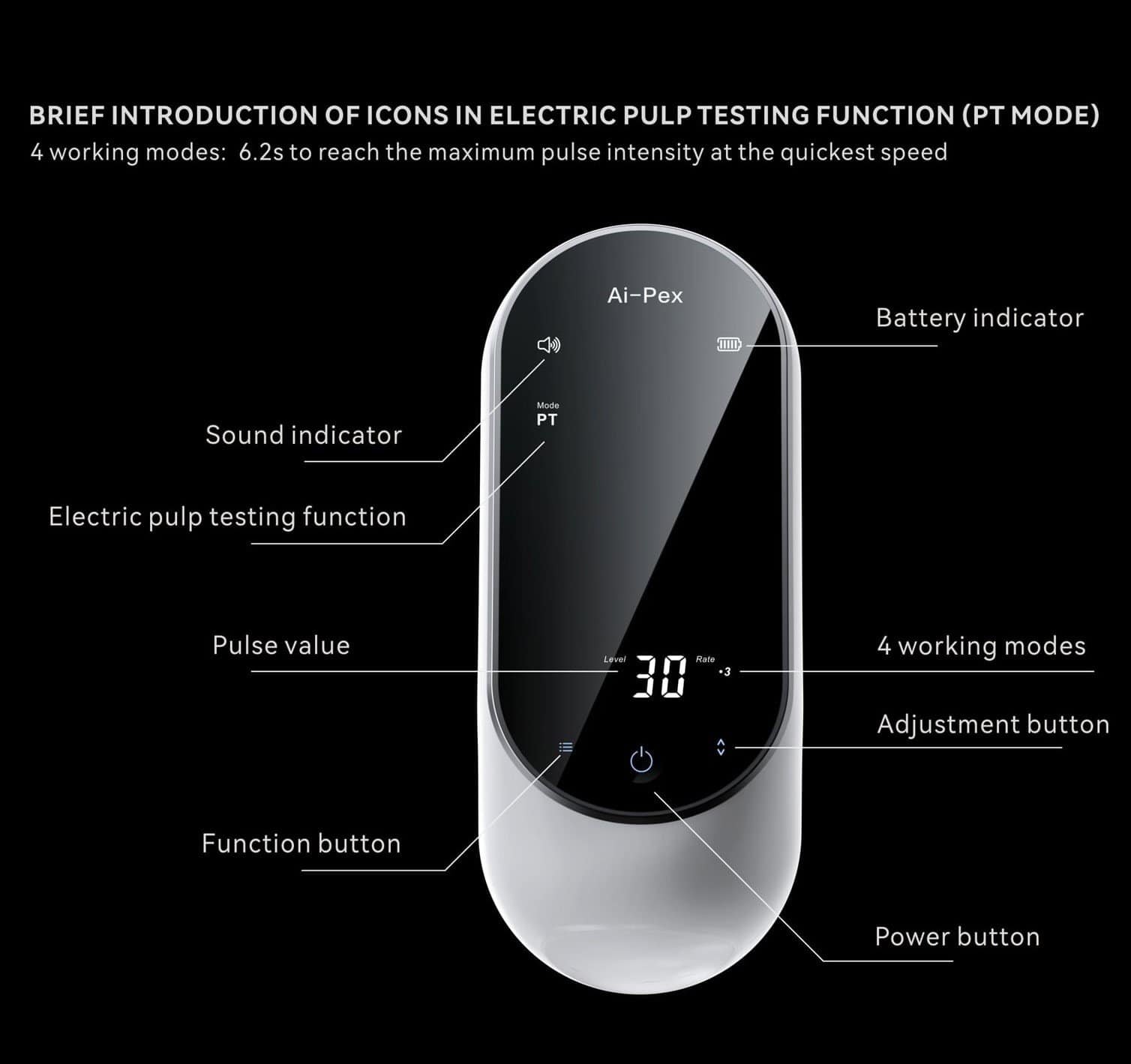 - 6.2 seconds to reach maximum pulse intensity (PT mode)