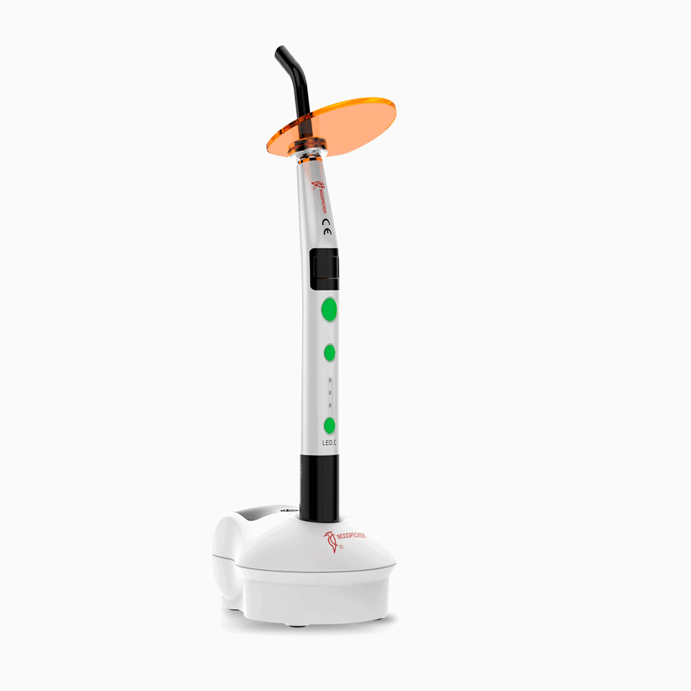The Woodpecker LED C Light Cure utilizes the principle of ray radiation to rapidly solidify light-sensitive resin materials. By delivering high-intensity light in a short time, it accelerates dental restorations and is also effective for solidifying teeth whitening materials.