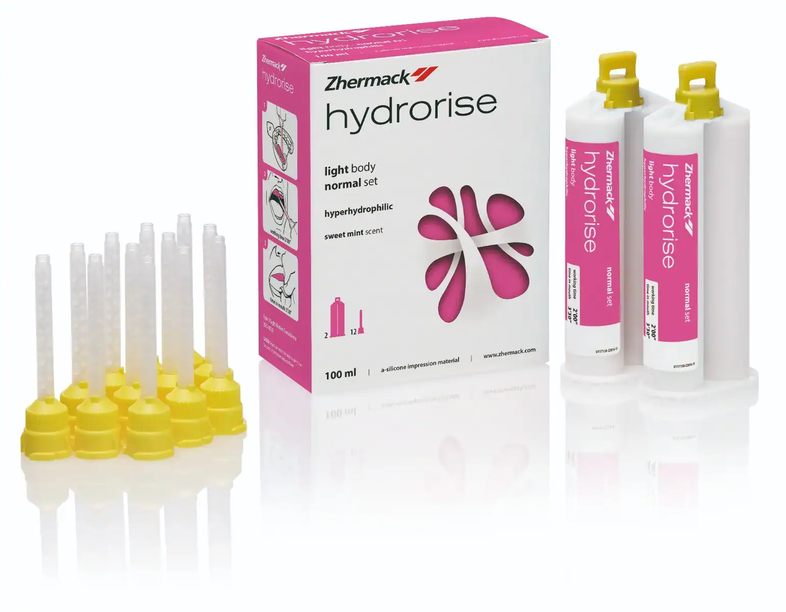 Zhermack Hydrorise is a high-performance, hyper-hydrocompatible A-silicone impression material designed for high-precision dental impressions. It adapts to different impression techniques, including double-step impressions, simultaneous double-viscosity impressions, and monophase techniques, across a wide range of clinical situations.